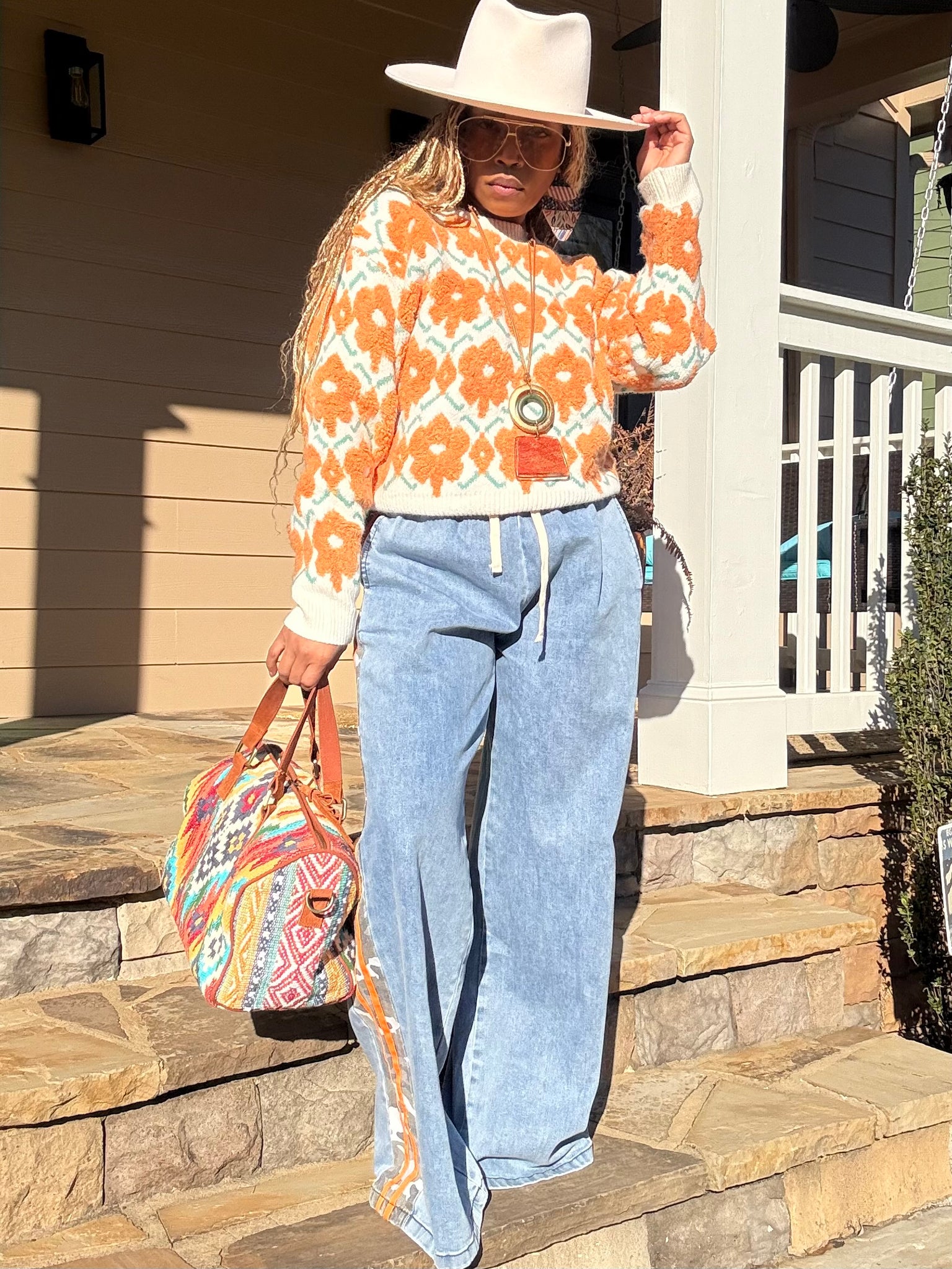 Funky vibes! Medium wash denim. Elastic waist w/ drawstring. Side & rear POCKETS! Side orange racer stripes w/ olive & light grey camo print. Dropped crotch, loose body fit. Wide leg pants hem. 31” crotch to hem inseam, 12” front waist to crotch rise.