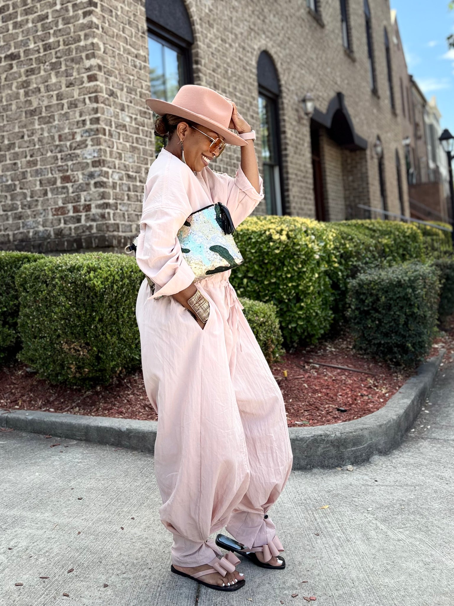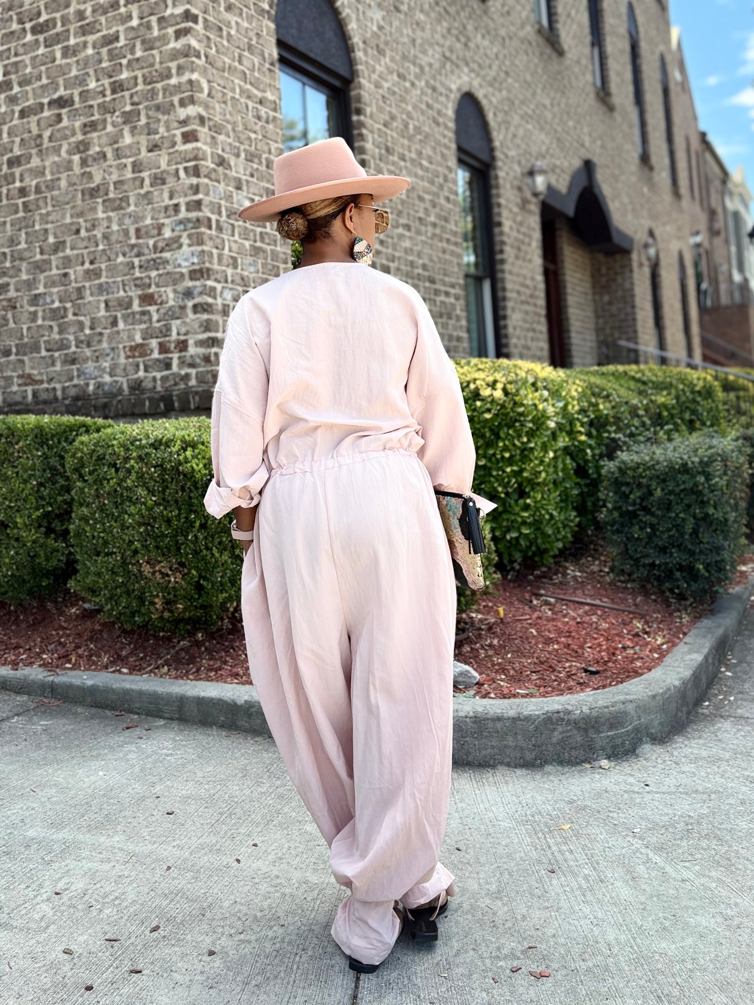 For the fashionable boho gal. Oversized all over fit. Round neckline, button up front closure. Dropped shoulder, wide long sleeves w/ button cuff closure. Adjustable waist cinching pull drawstring. Harem, dropped crotch. Side POCKETS! Wide, balloon legs. Optional tapered ankle button, pleated hem. 26” inseam