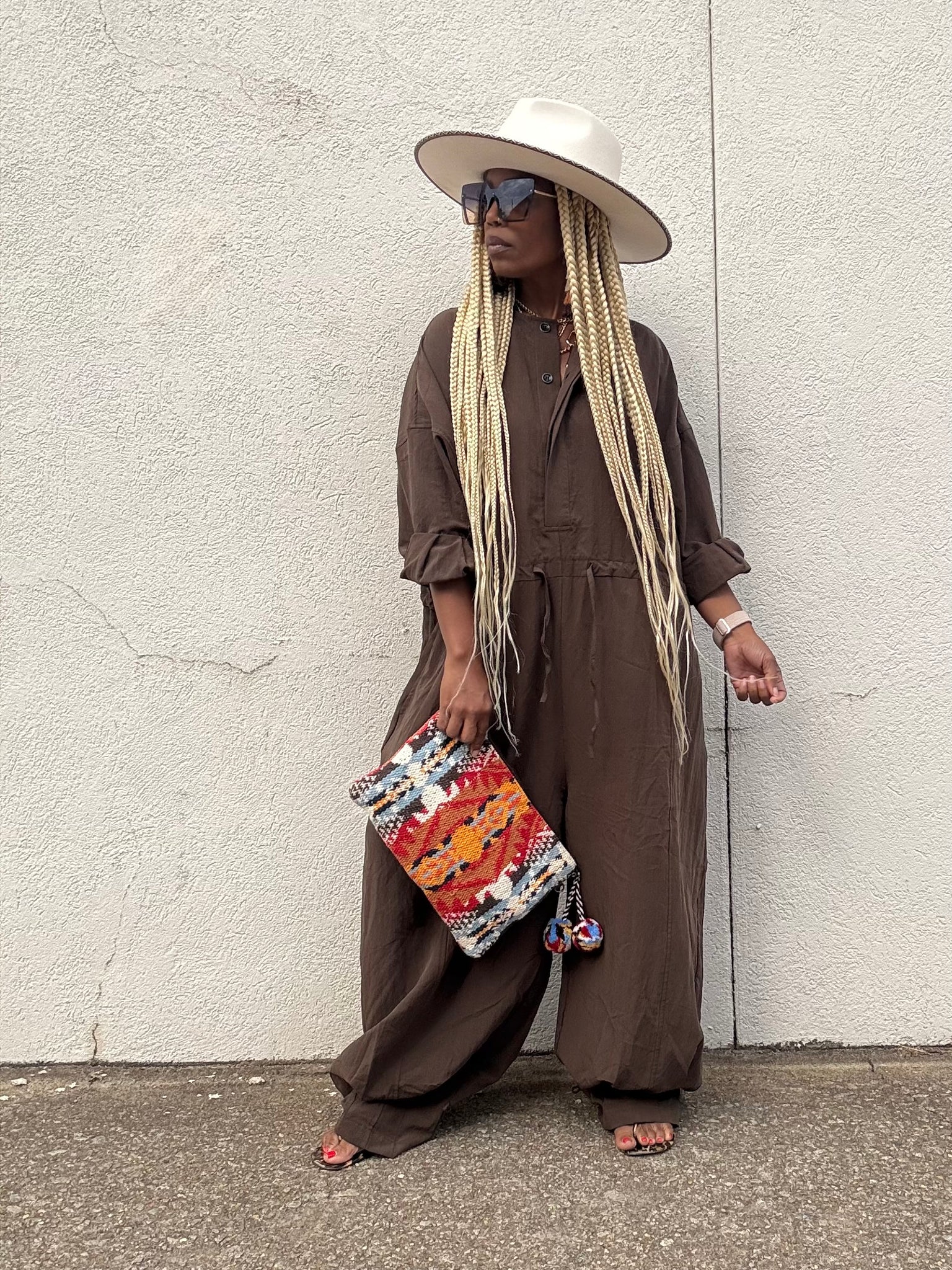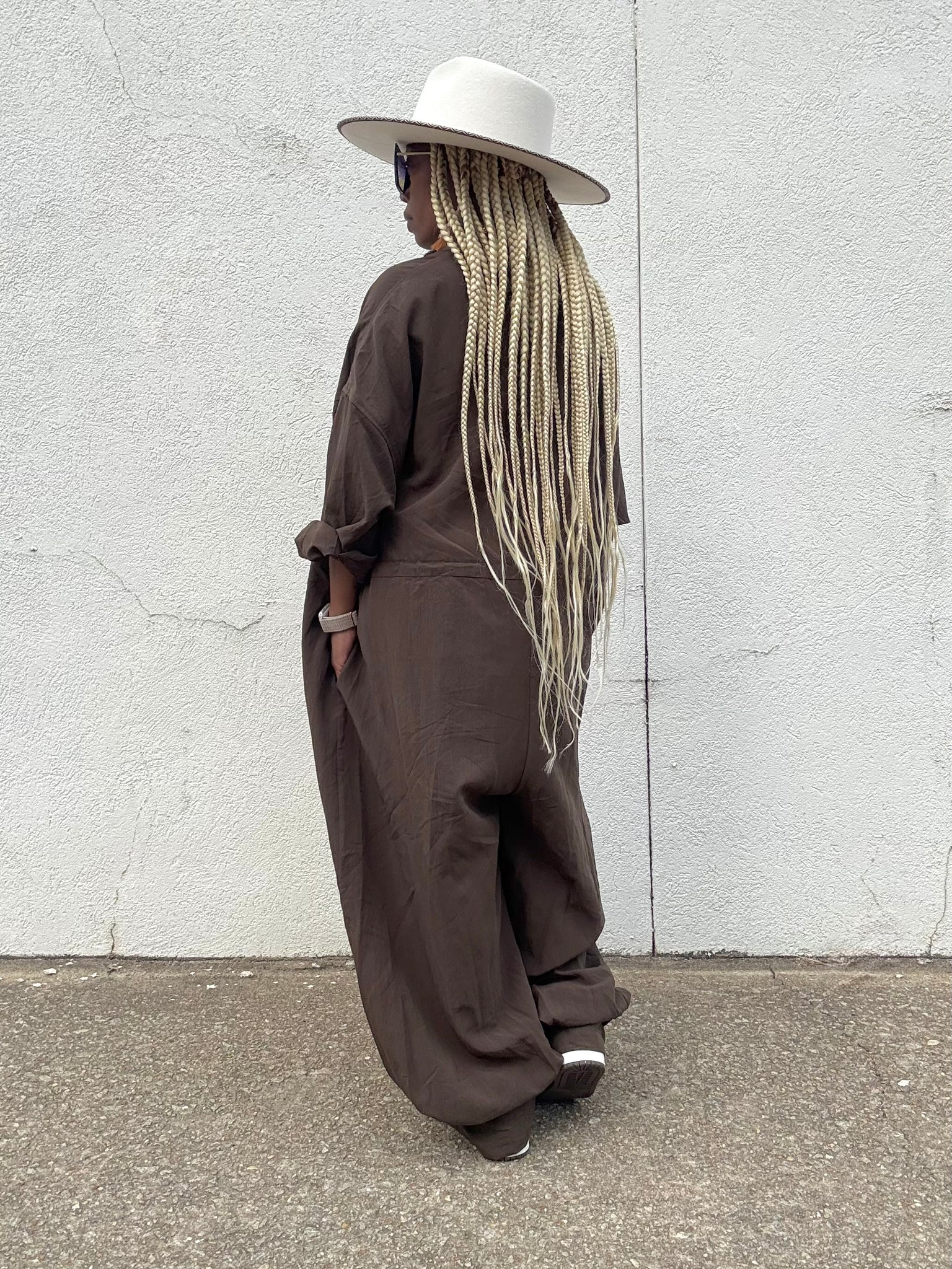 For the fashionable boho gal. Oversized all over fit. Round neckline, button up front closure. Dropped shoulder, wide long sleeves w/ button cuff closure. Adjustable waist cinching pull drawstring. Harem, dropped crotch. Side POCKETS! Wide, balloon legs. Optional tapered ankle button, pleated  hem. 26” inseam