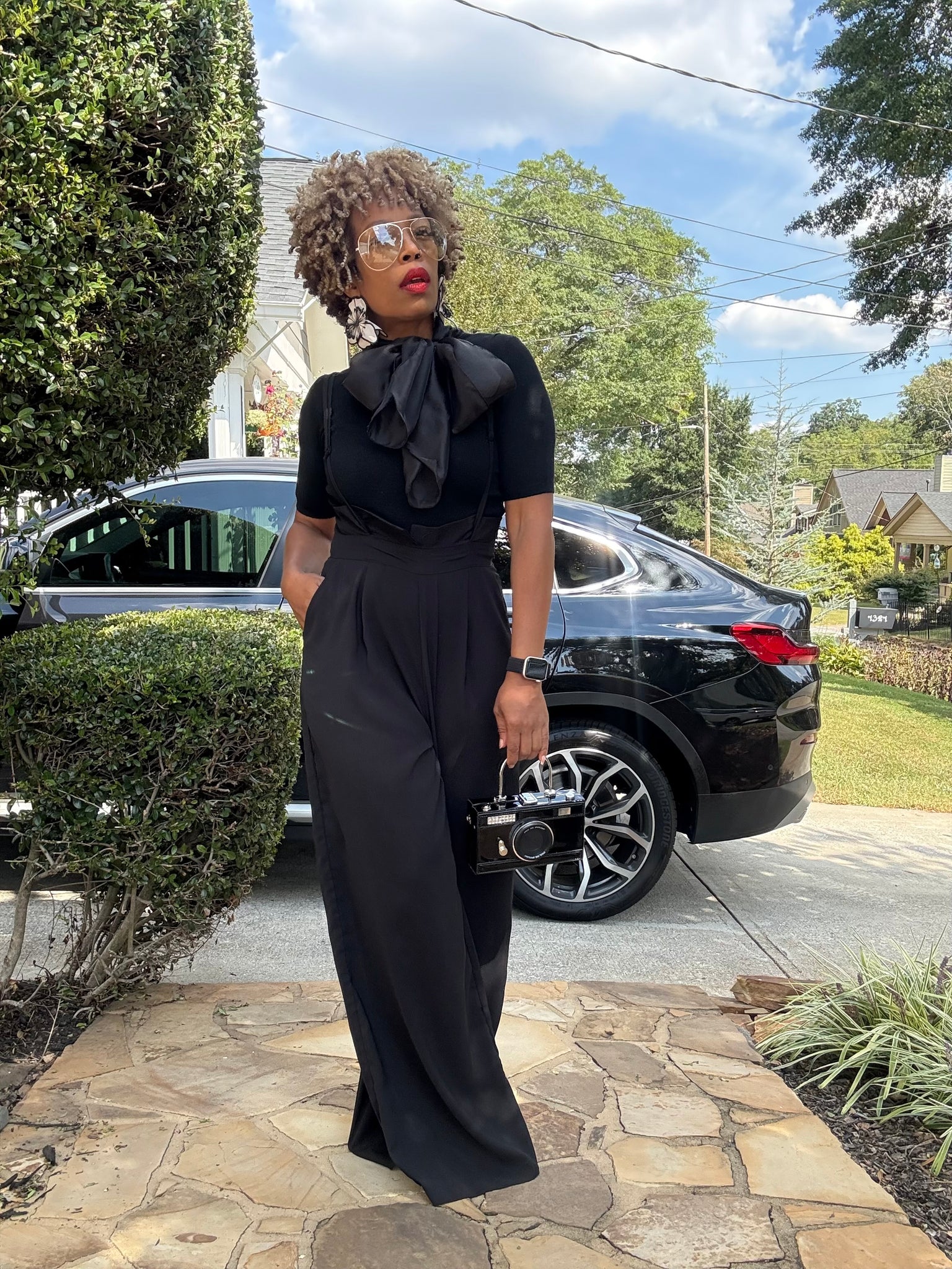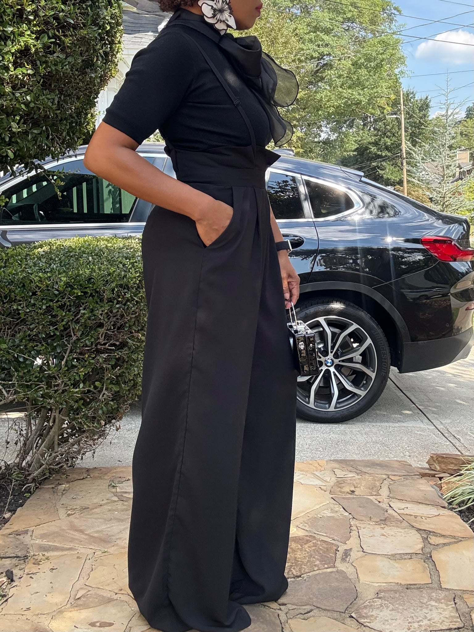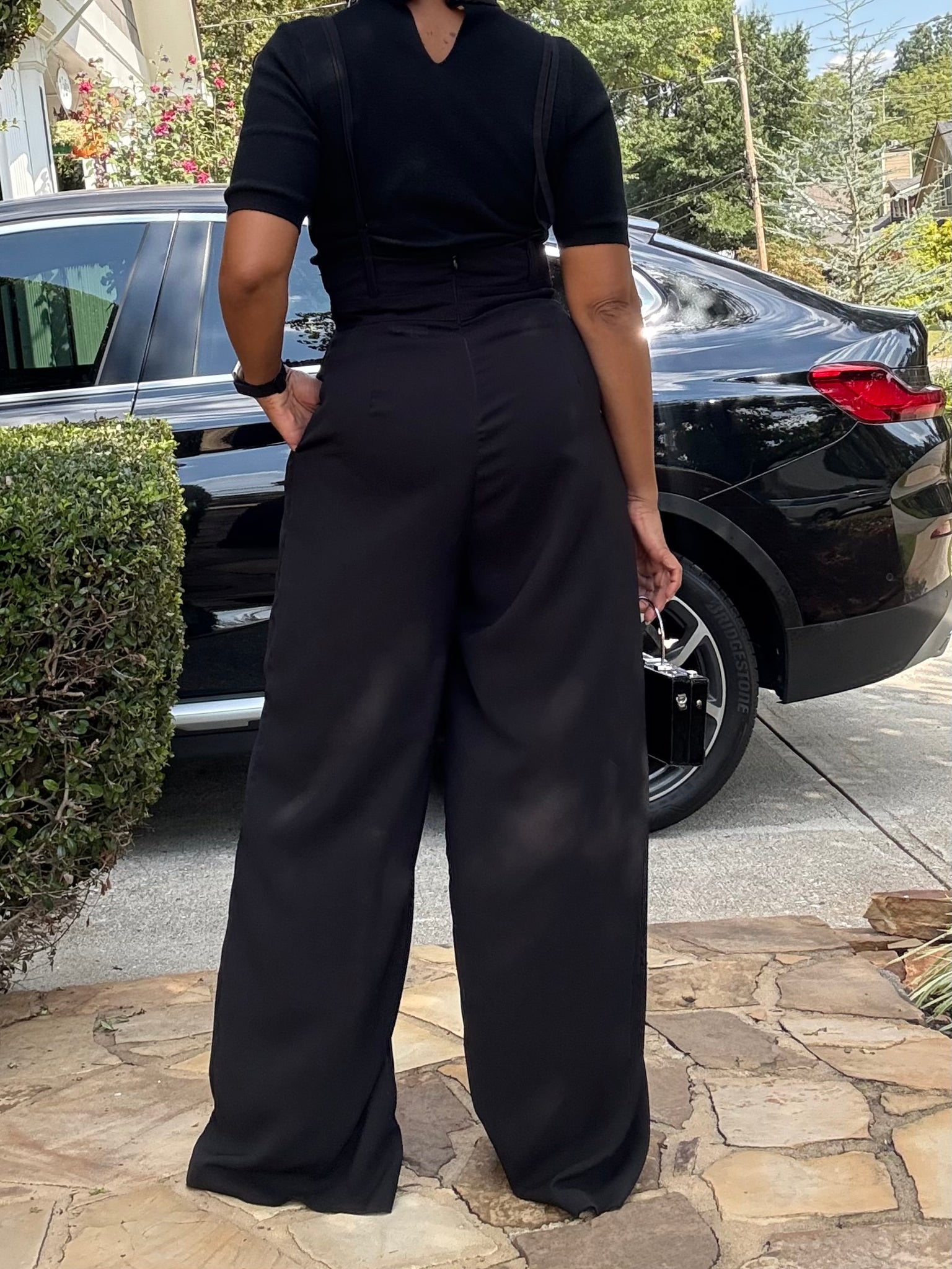 Paperbag style waist. Removable & adjustable suspenders. Side POCKETS! Rear zipper w/ hook & eye cluster. Wide leg pant hem. 30” inseam