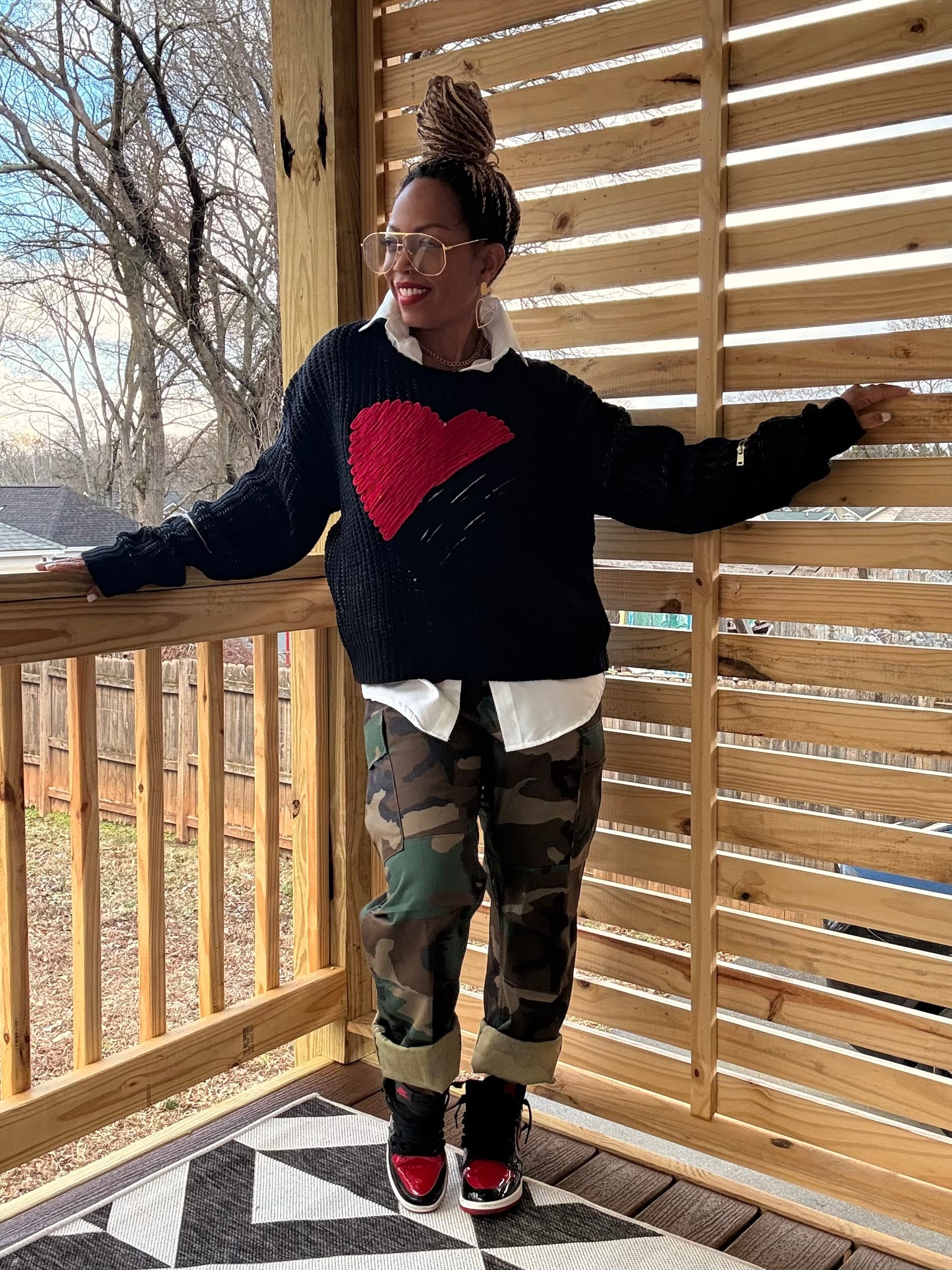 Great casual Galentine’s option! Crochet knit sweater. Front Black/Red yarn threaded heart. Wide, scoop neckline. Dropped shoulder seam. Long sleeves, zipper detail, ribbed cuff. Loose, wide body fit. Waist length, ribbed hem.