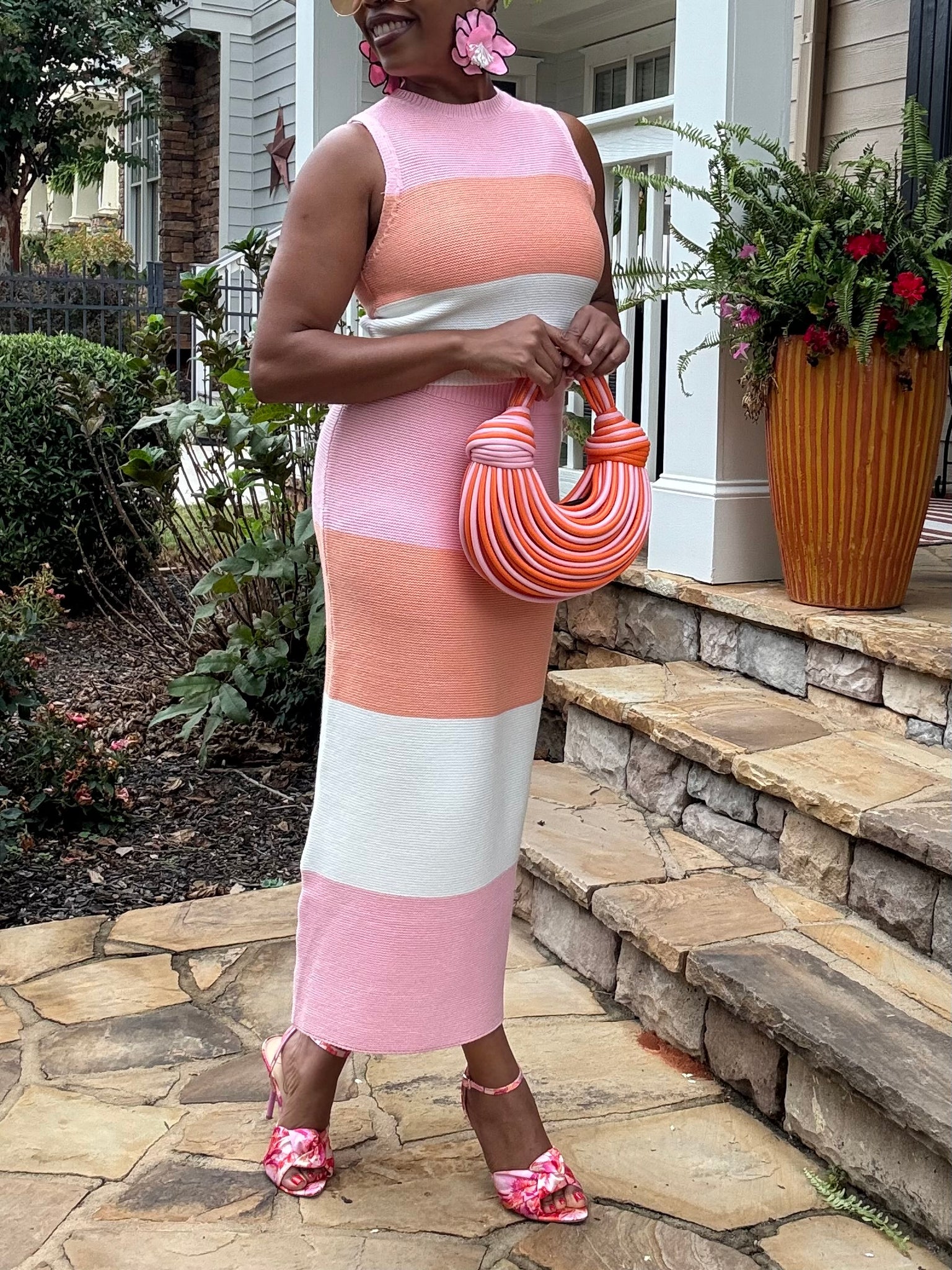 Great transition knit for Fall! Conservative if needed but fitted bodycon appeal. 2 pc set. Wide, horizonal color blocked stripes.