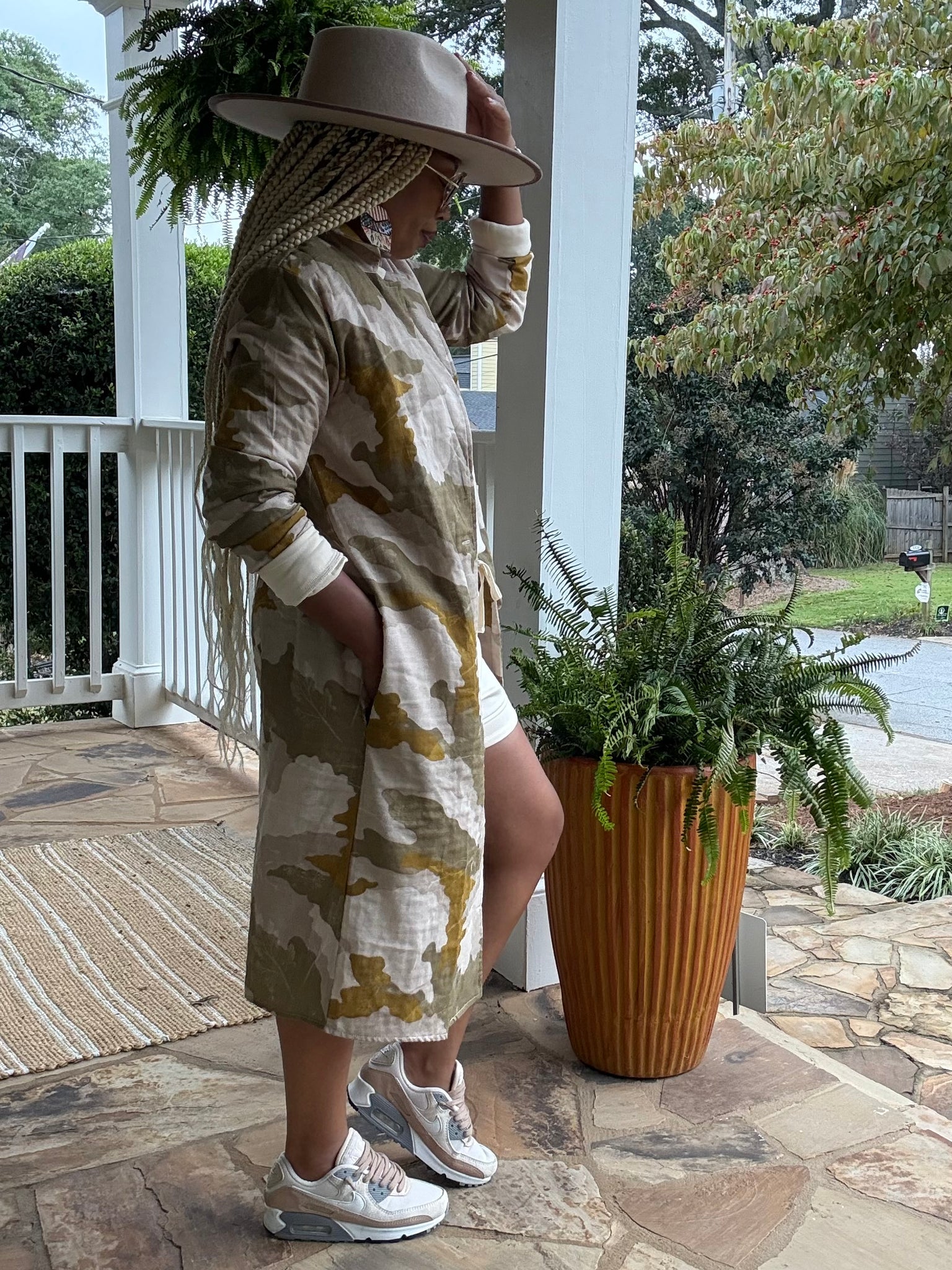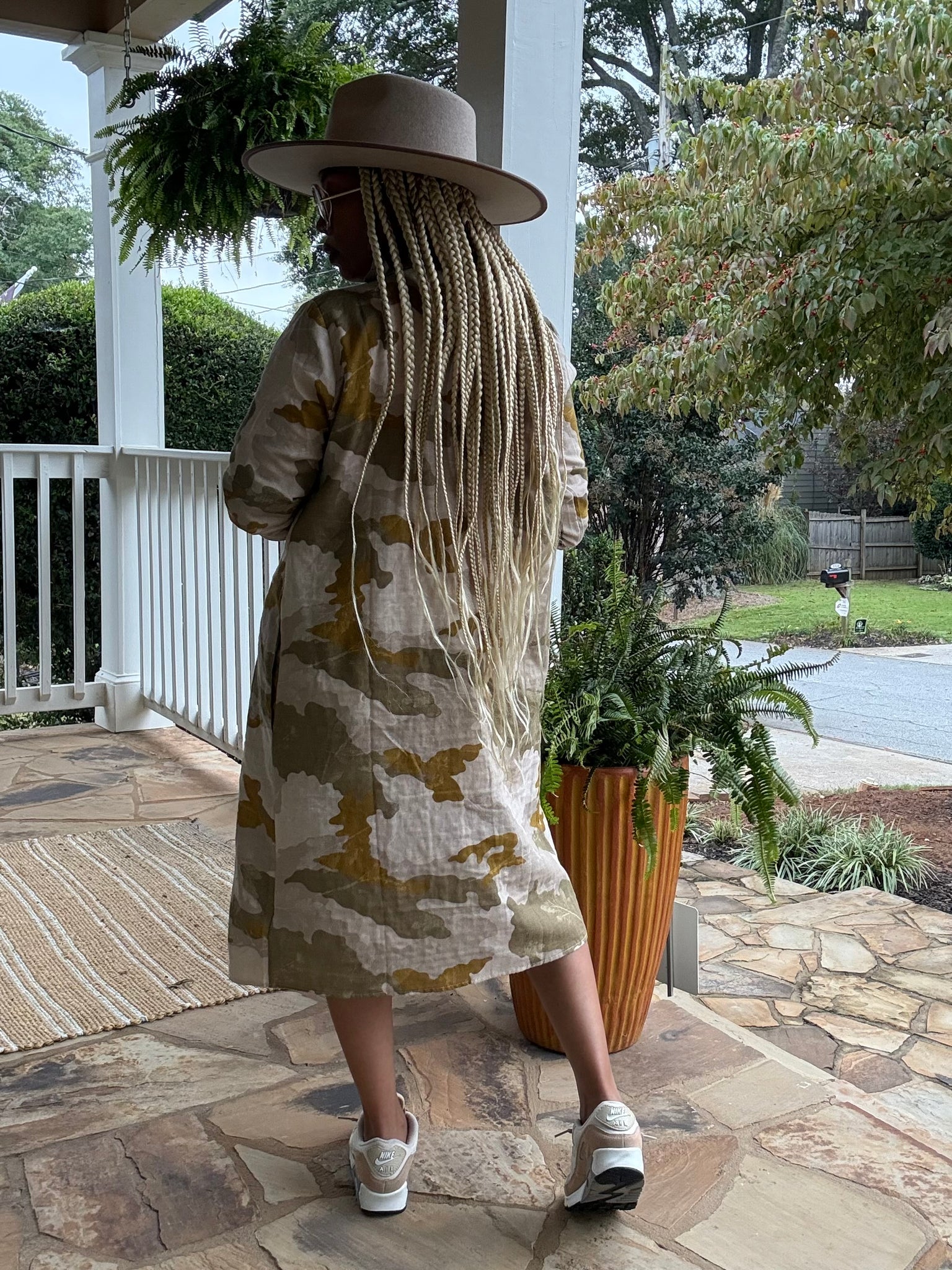 Cute lil neutral camo print layering piece for when it cools down. Turn down collar neckline. Button up front closure. Long sleeves, side hidden POCKETS! Midi length hem.
