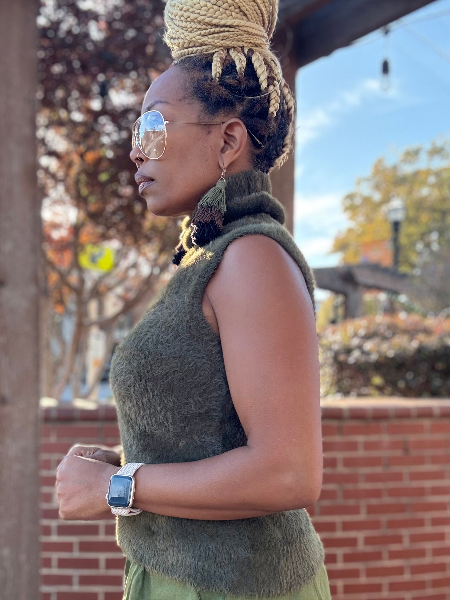 Great top w/ camos & booties as well! Olive green, super soft & fuzzy texture. Turtleneck, pullover entry. Sleeveless. Fitted body, waist length hem.