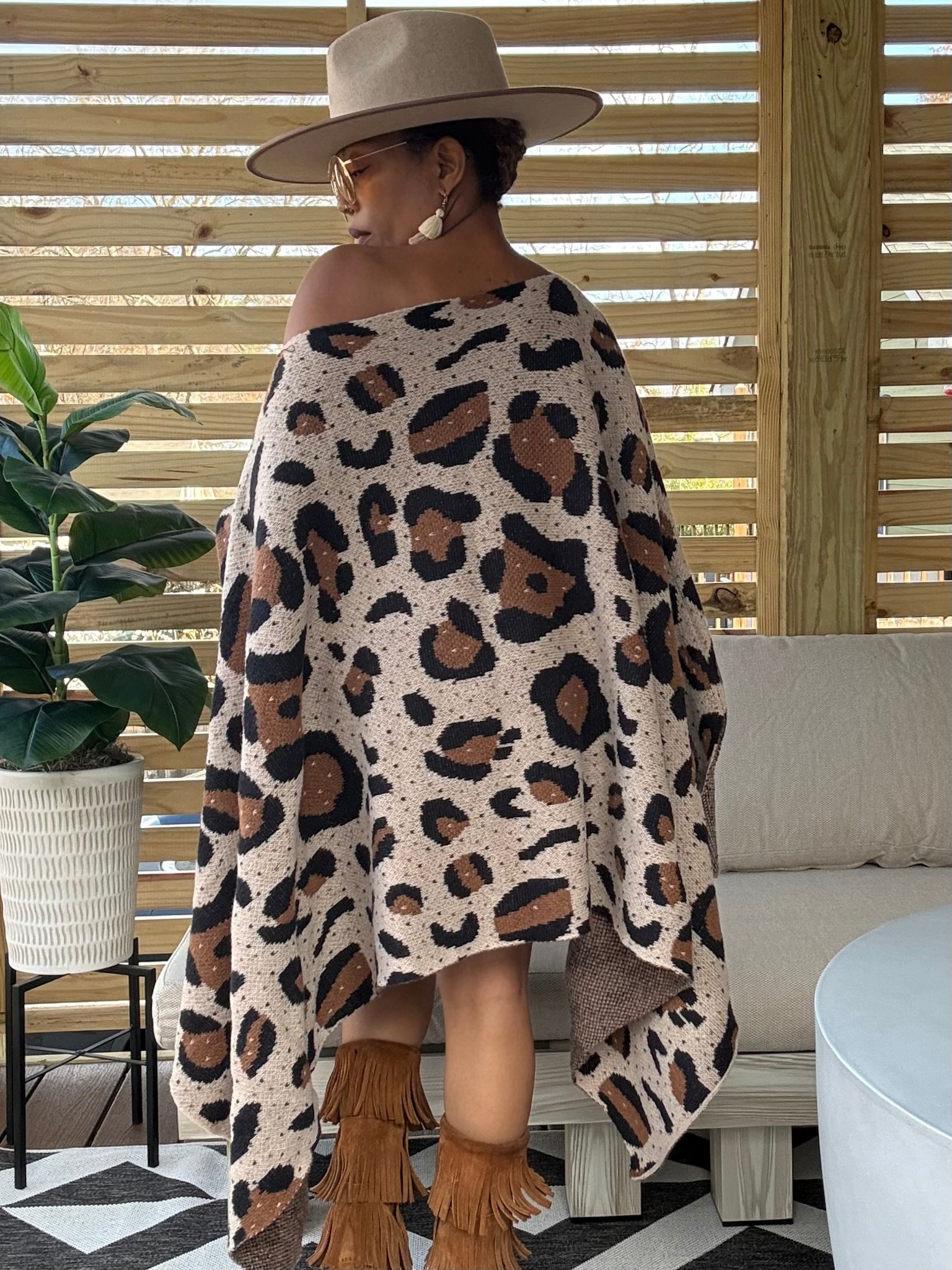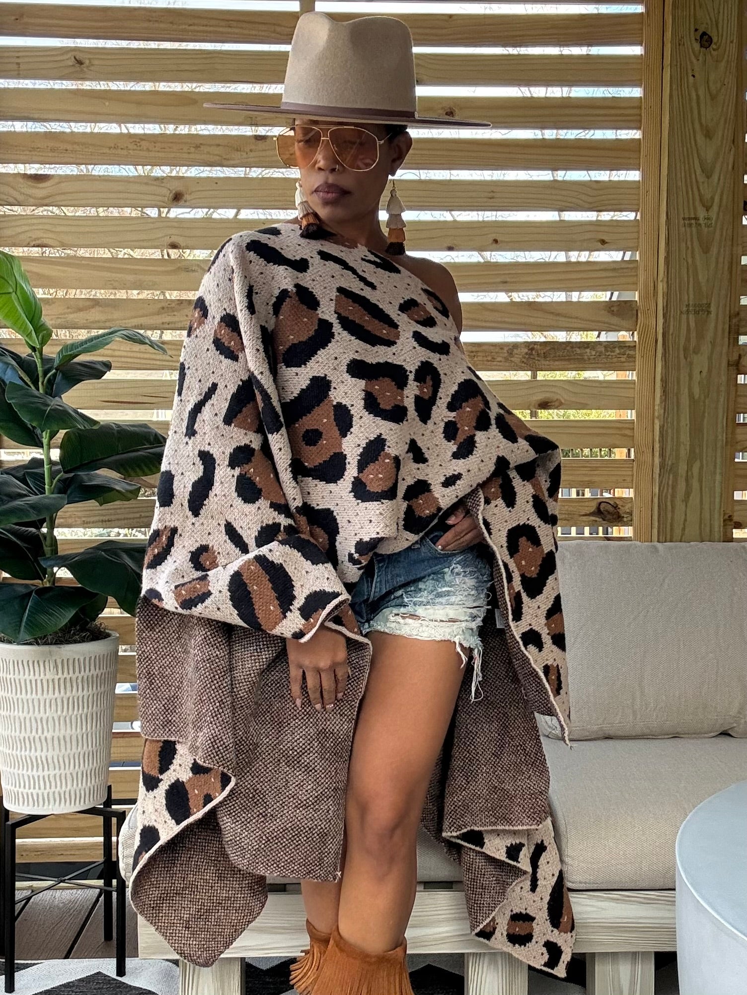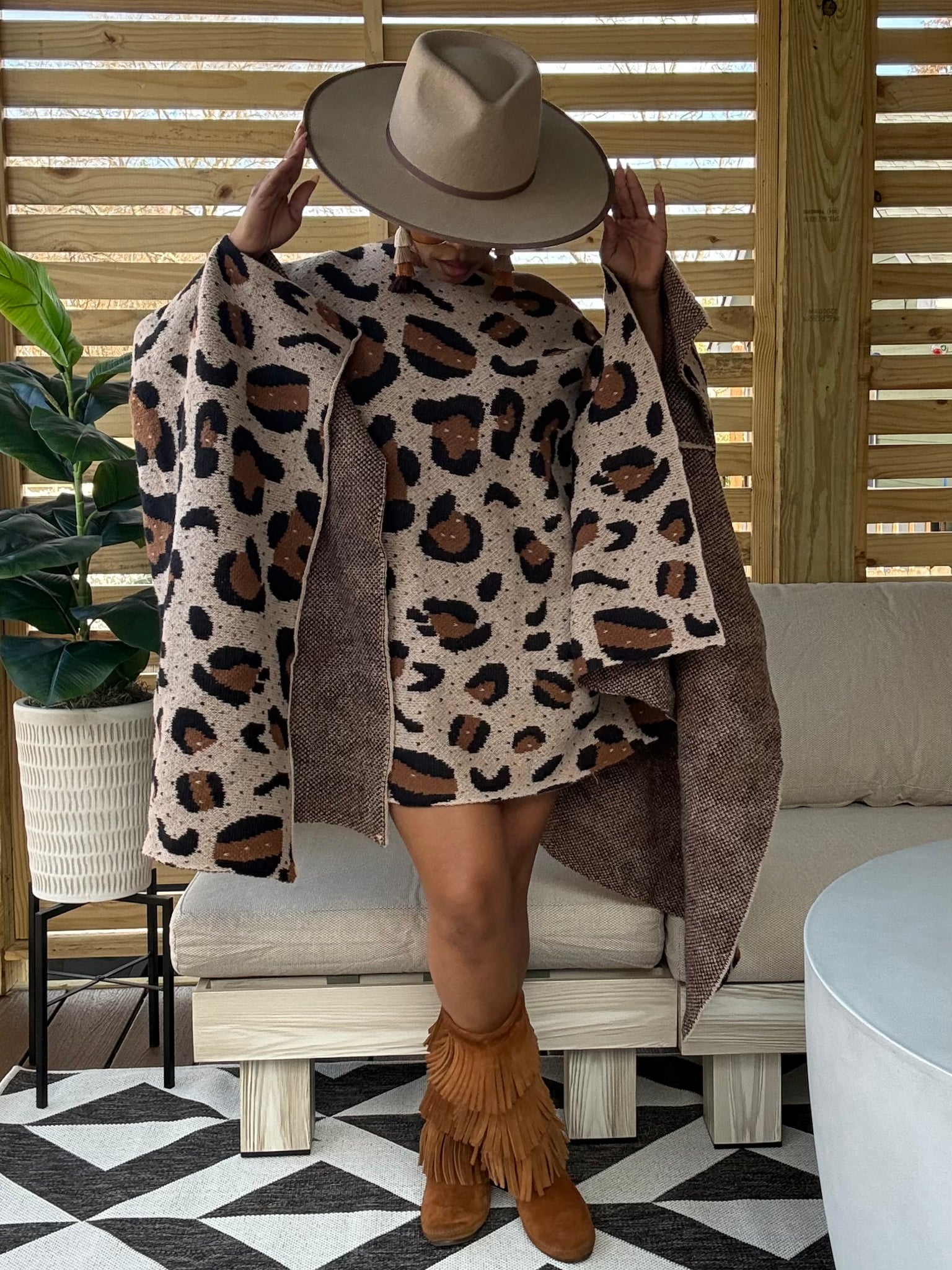 Not a coat person? This is a great piece for upcoming cold weather. Sweater knit, classic leopard print. Wide 12” neckline. No sleeves, poncho style side slits. Wide open body fit. Asymmetric, shark bite above knee length hem.