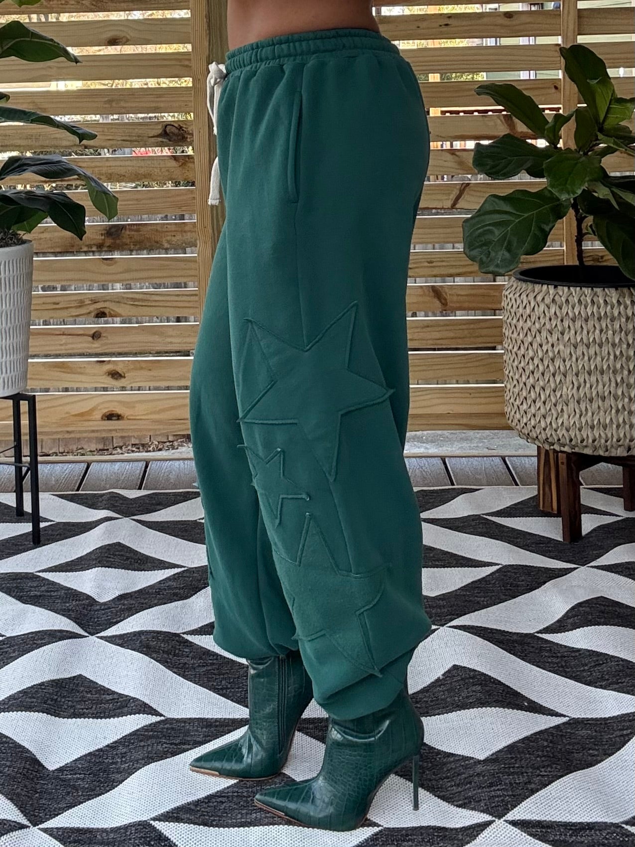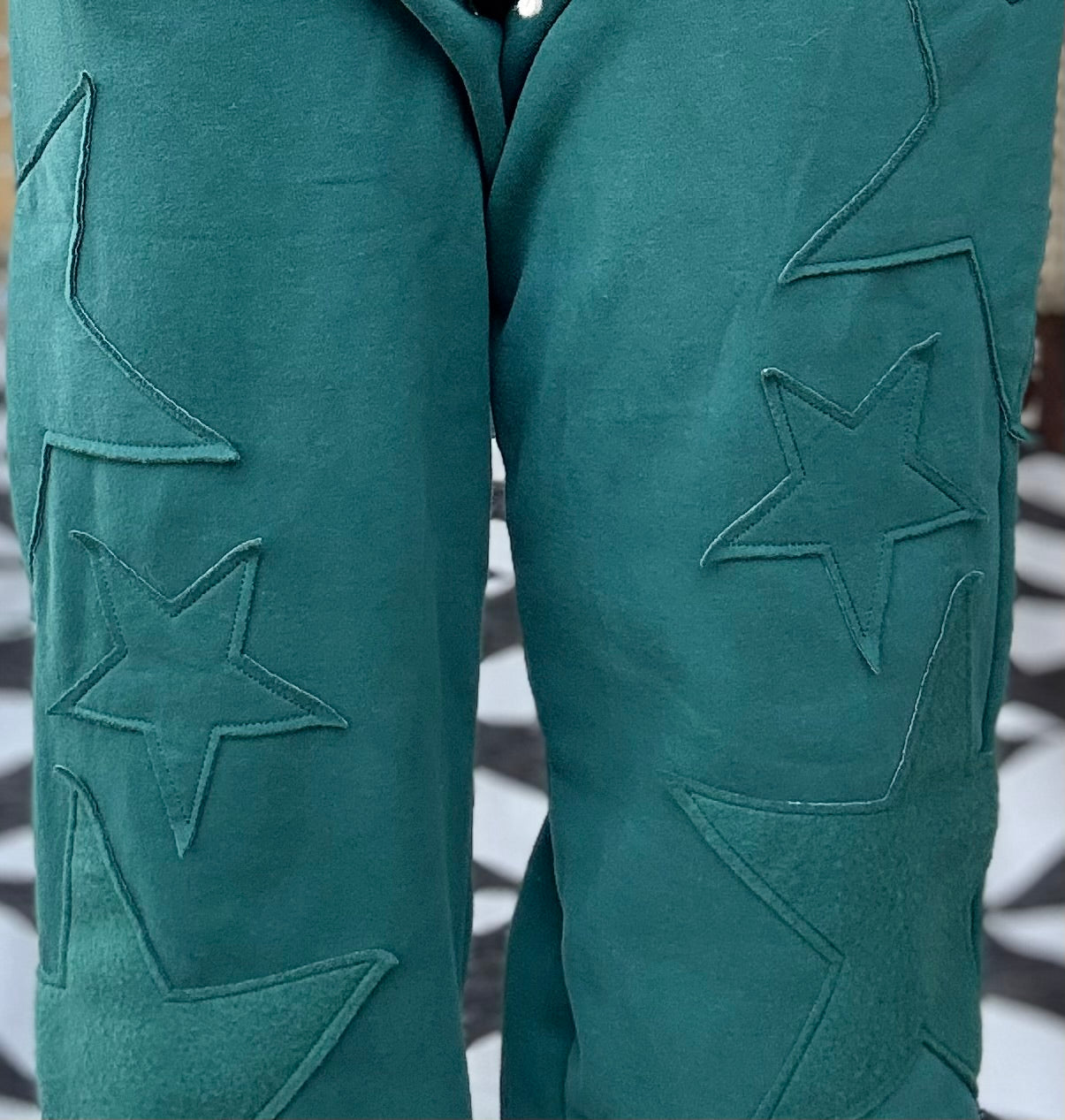 Classic jogger style pant. 3D, emerald green monochromatic stars attached. Elastic waistband w/ drawstring.  Side POCKETS! Loose pant legs, tapered elastic ankle hem. 31” inseam