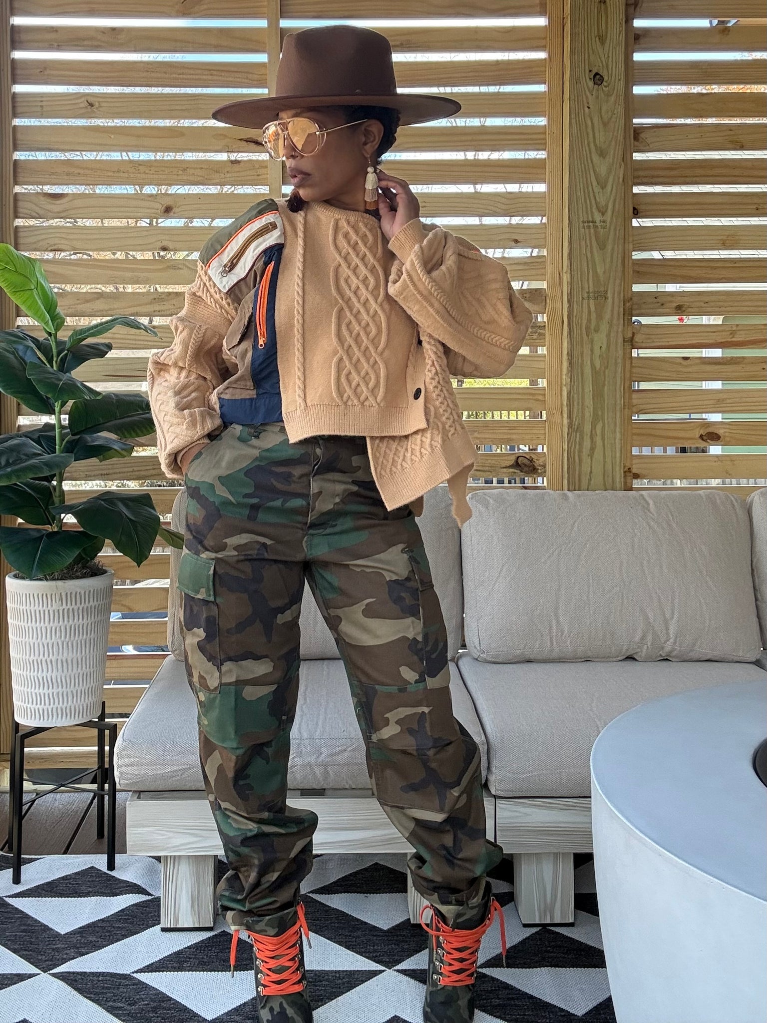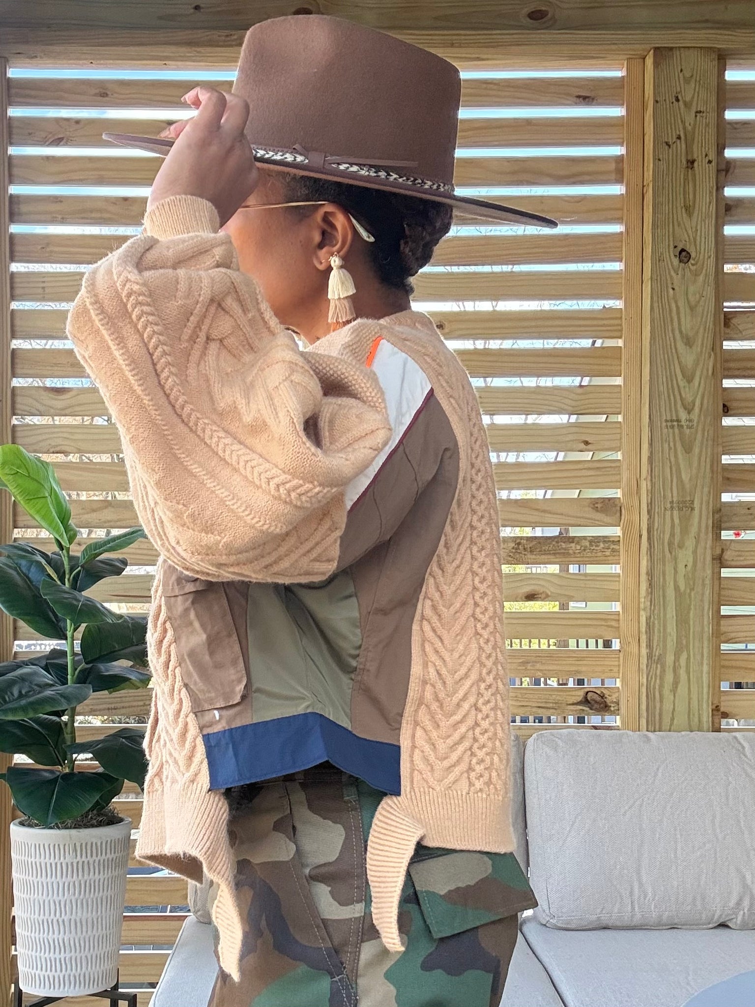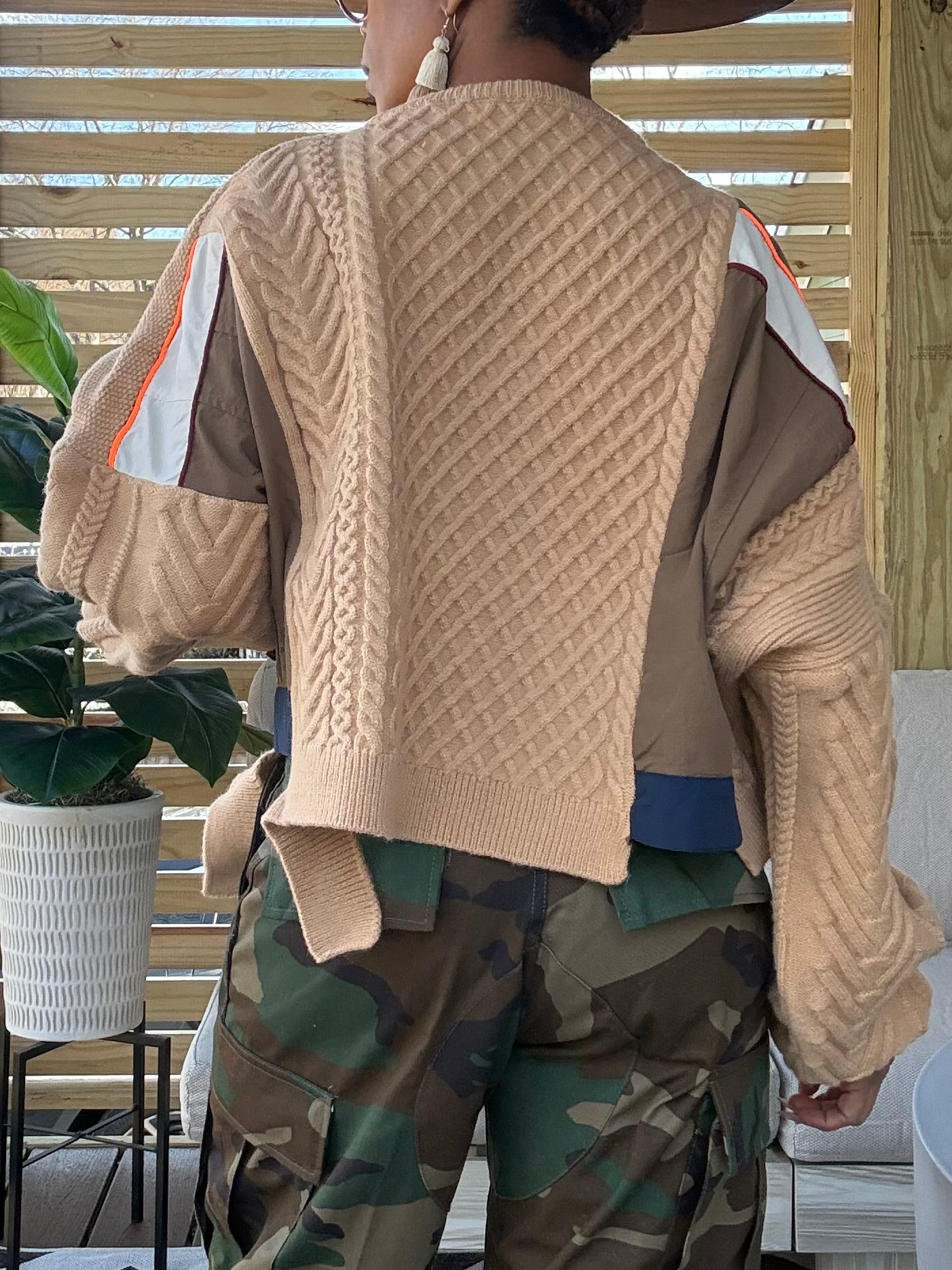 3rd color option! Worth every penny! Super thick & warm. Large cable knit. Round neckline, pullover entry.  Button up side-front closure. Utility zipper/parachute details. Asymmetric, wide body fit w/ side strap. Cropped ish length hem.