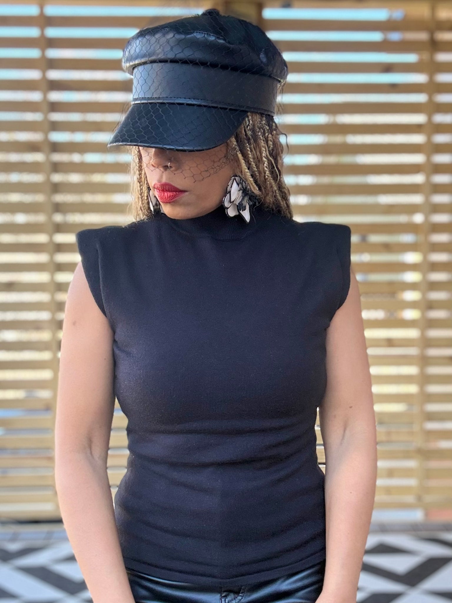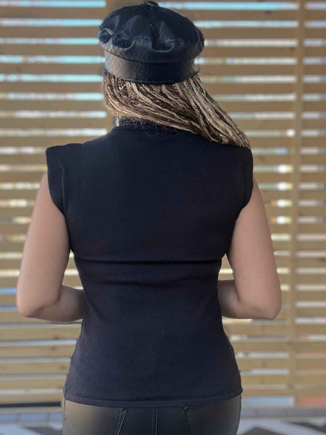 The shape & style is a perfect pairing w/ a wider or flared leg pant or shorts. Soft knit. Mock neckline, pullover entry. Square shoulder pads, sleeveless. Tapers into torso fit. Lower waist length hem.