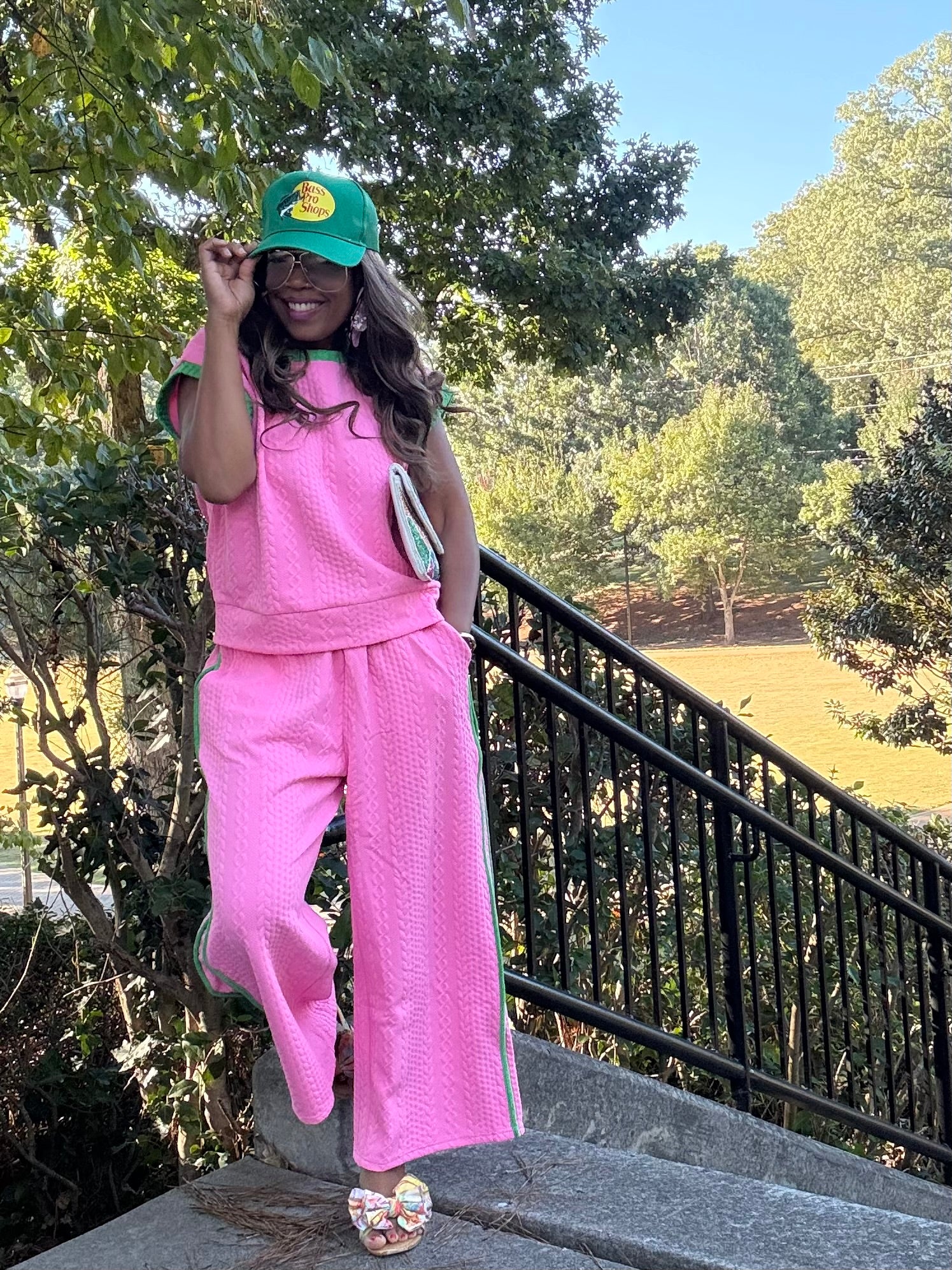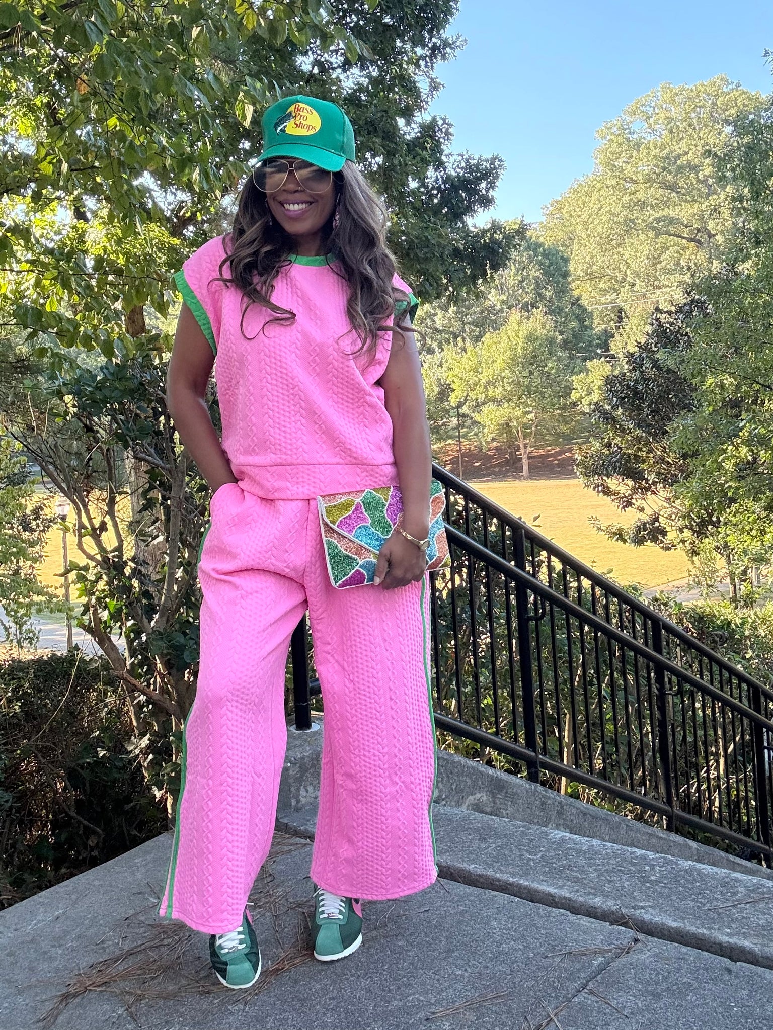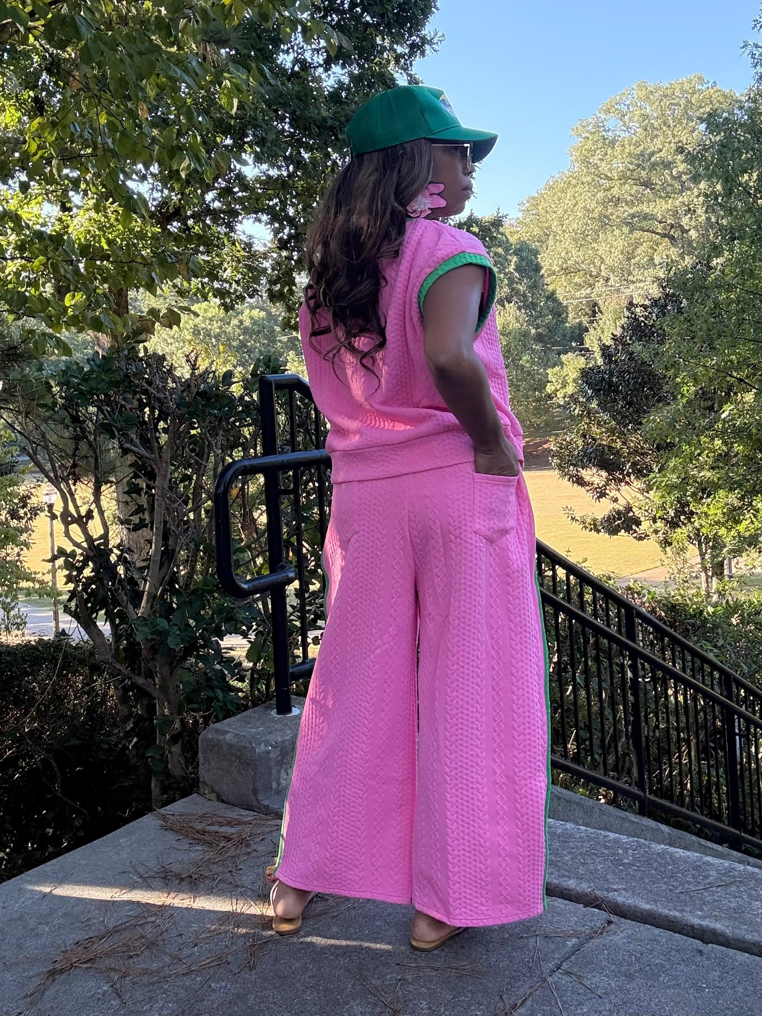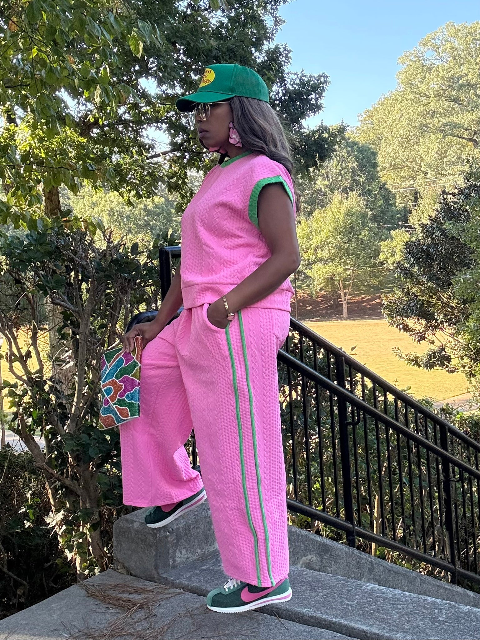 Bottom: Wide elastic waistband. Side & rear POCKETS! Side piping detail, double green stripes. Wide legs, cropped length hem. 24” inseam