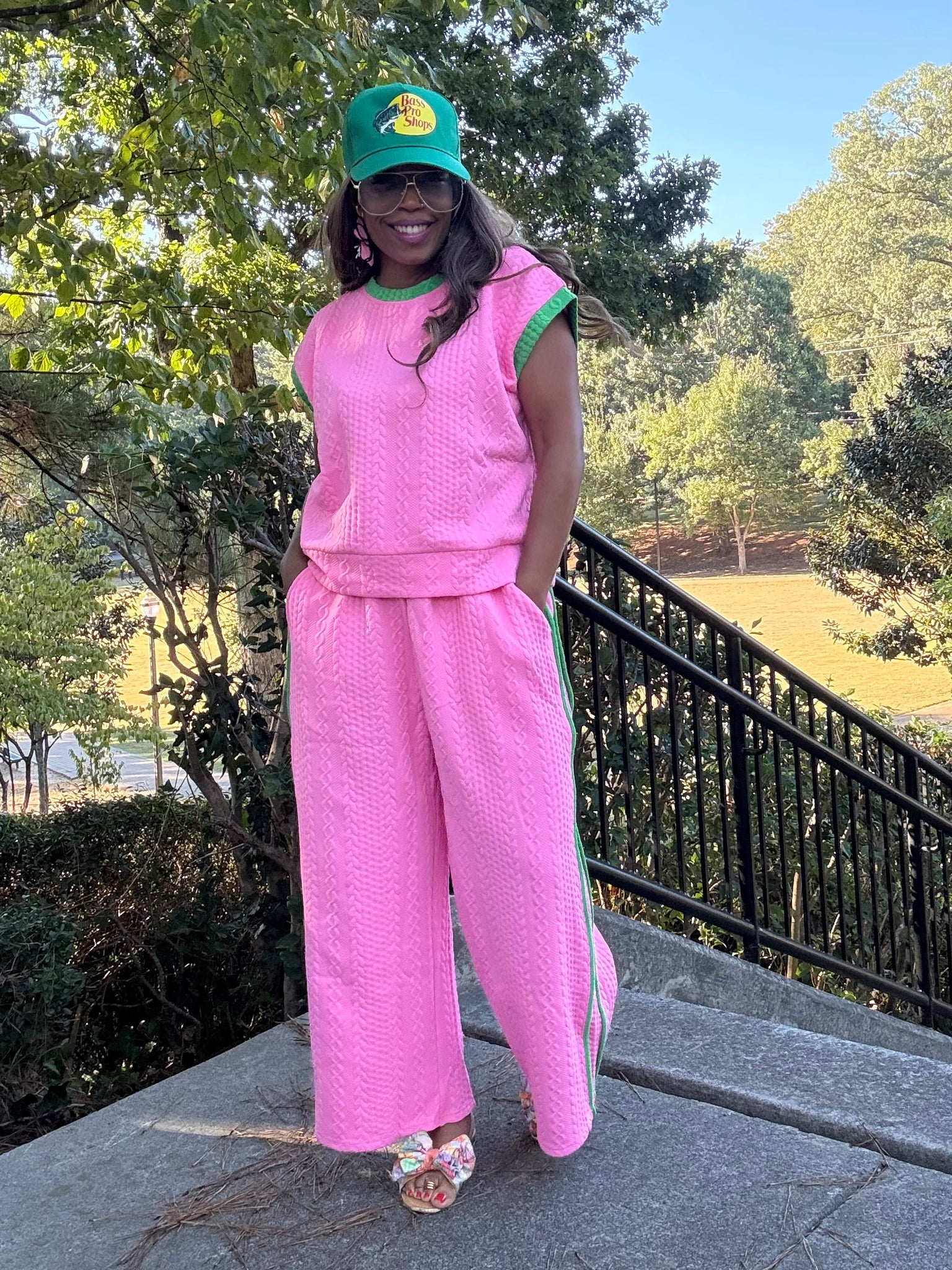 Comfy loungewear that’s for the streets! 2 pc set. Embossed cable print throughout.