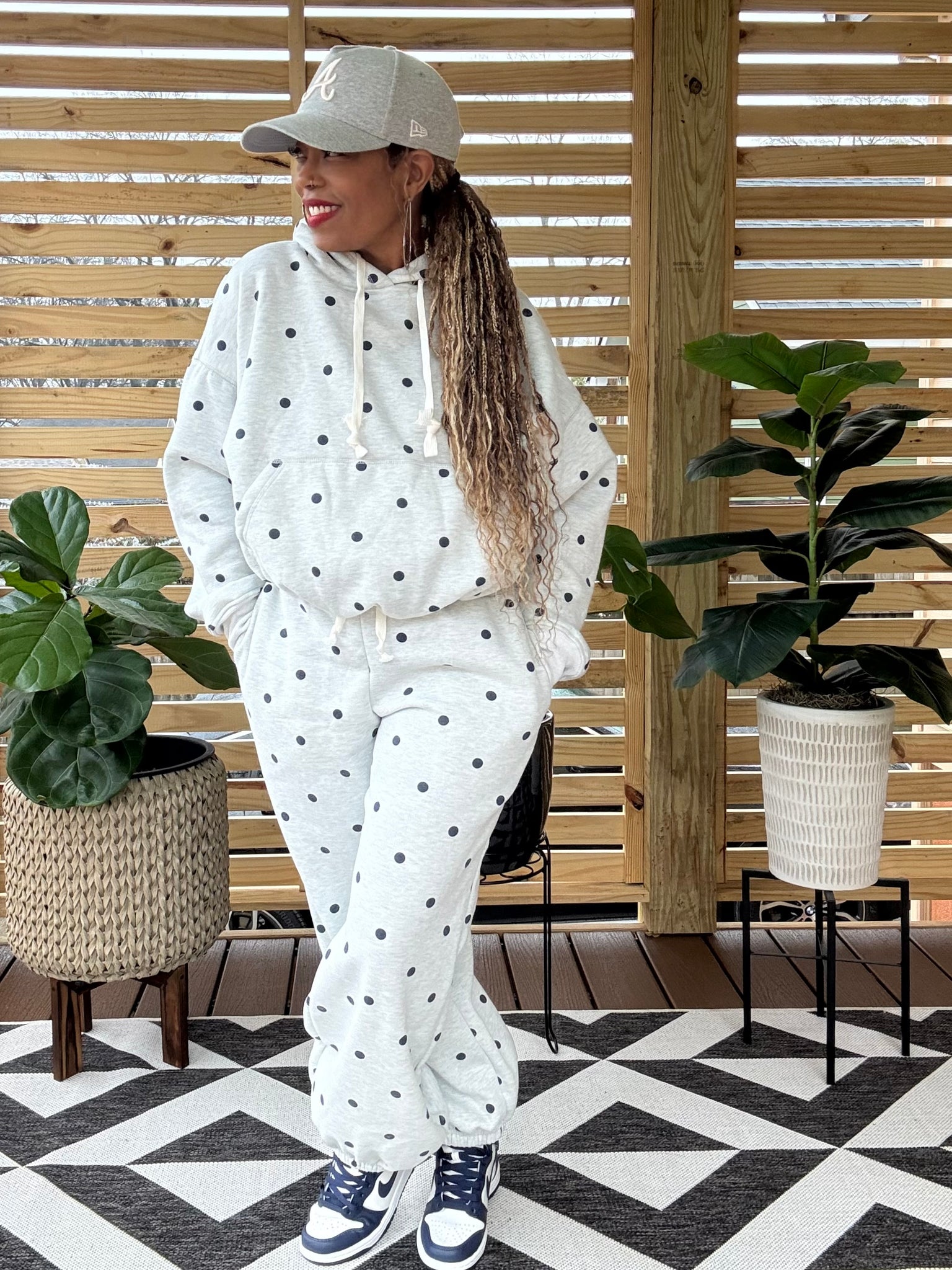 Grab your Dunk Lows or Gazelles & ride this vibe! Absolutely adorable. 2 pc set. Fleece heather grey w/ navy polka dots.