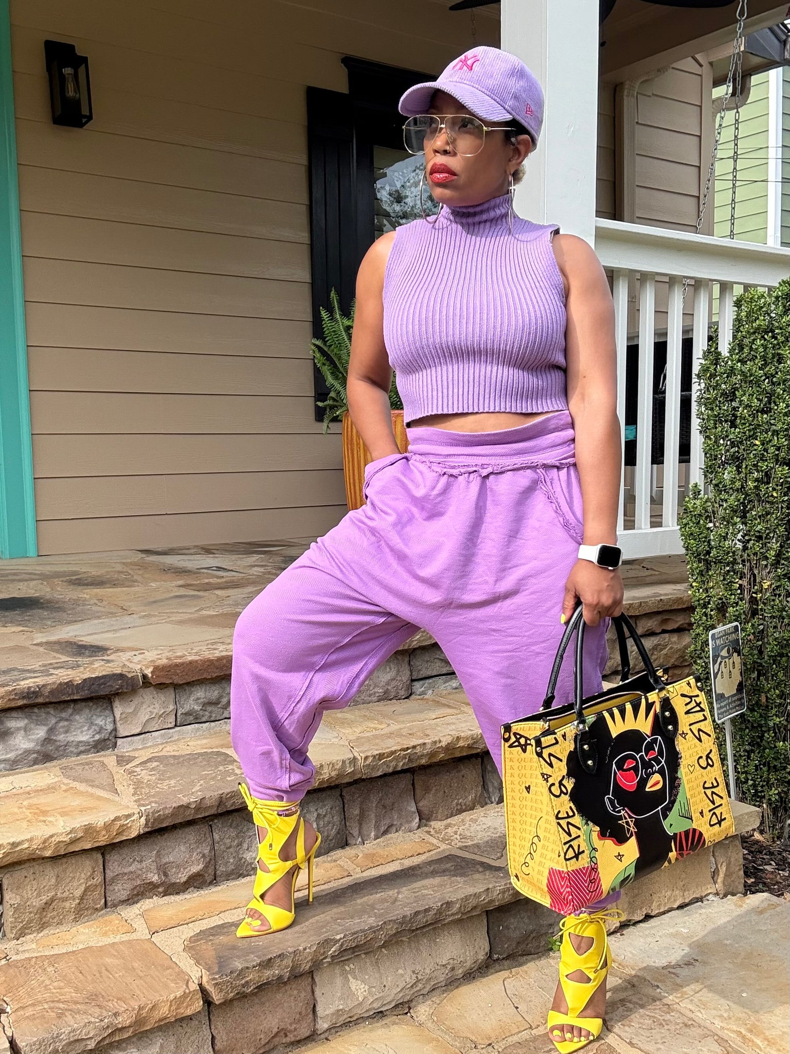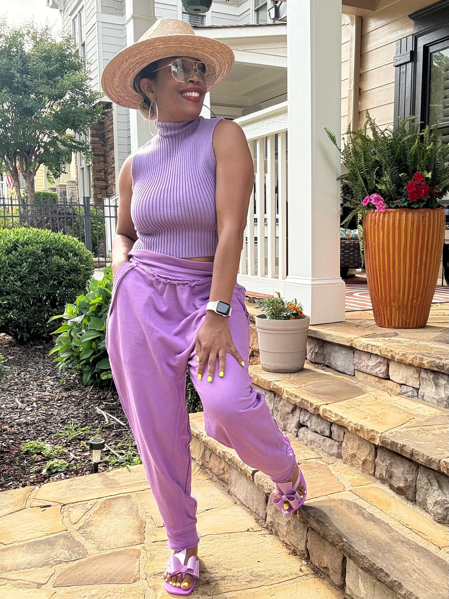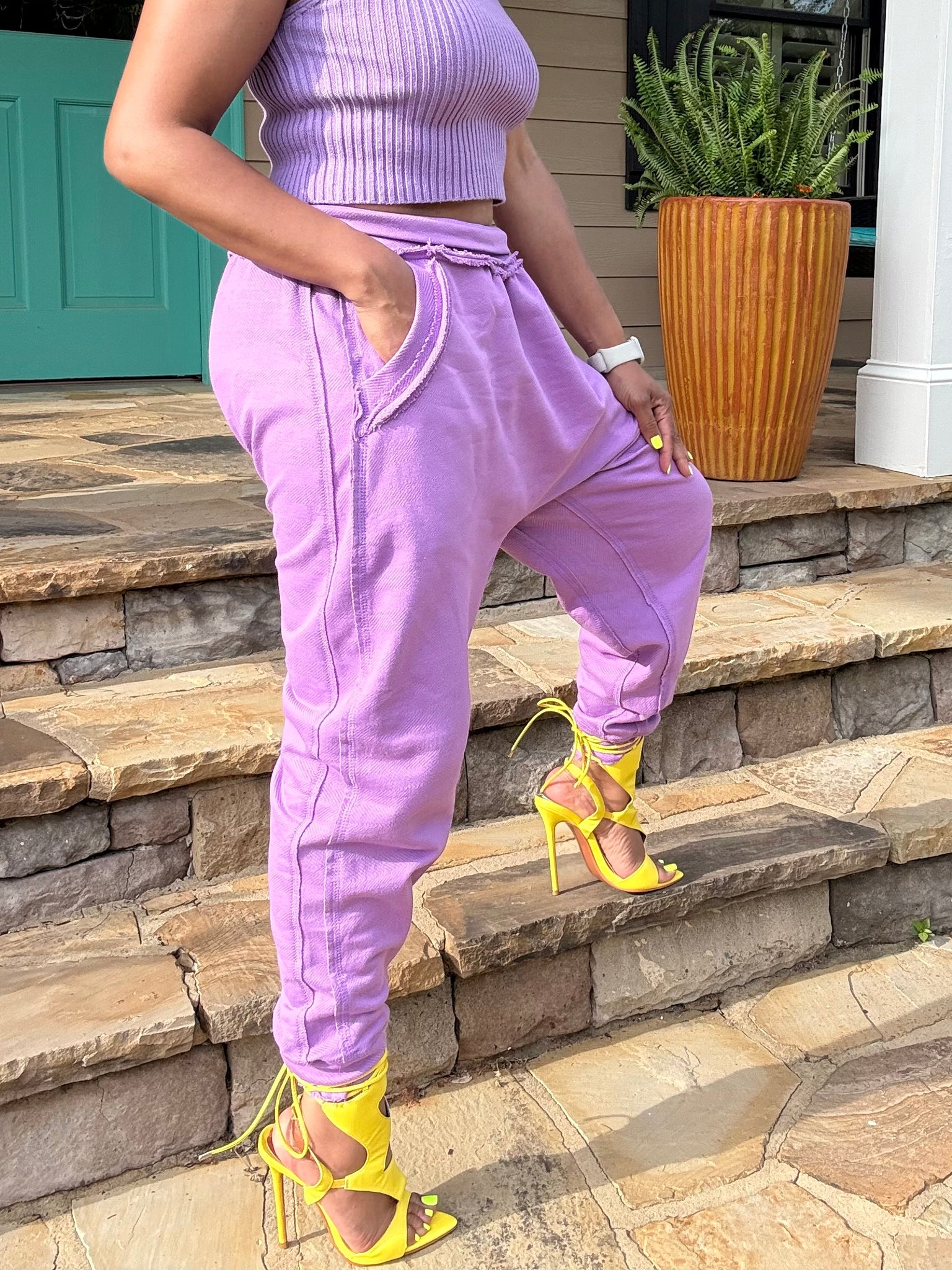Cute vibrant lounge pant. Lilac. Raw edge, exposed seam details. Paperbag style waist, inside pull drawstring. Side POCKETS! Harem, ropped crotch. Tapered ankle hem.