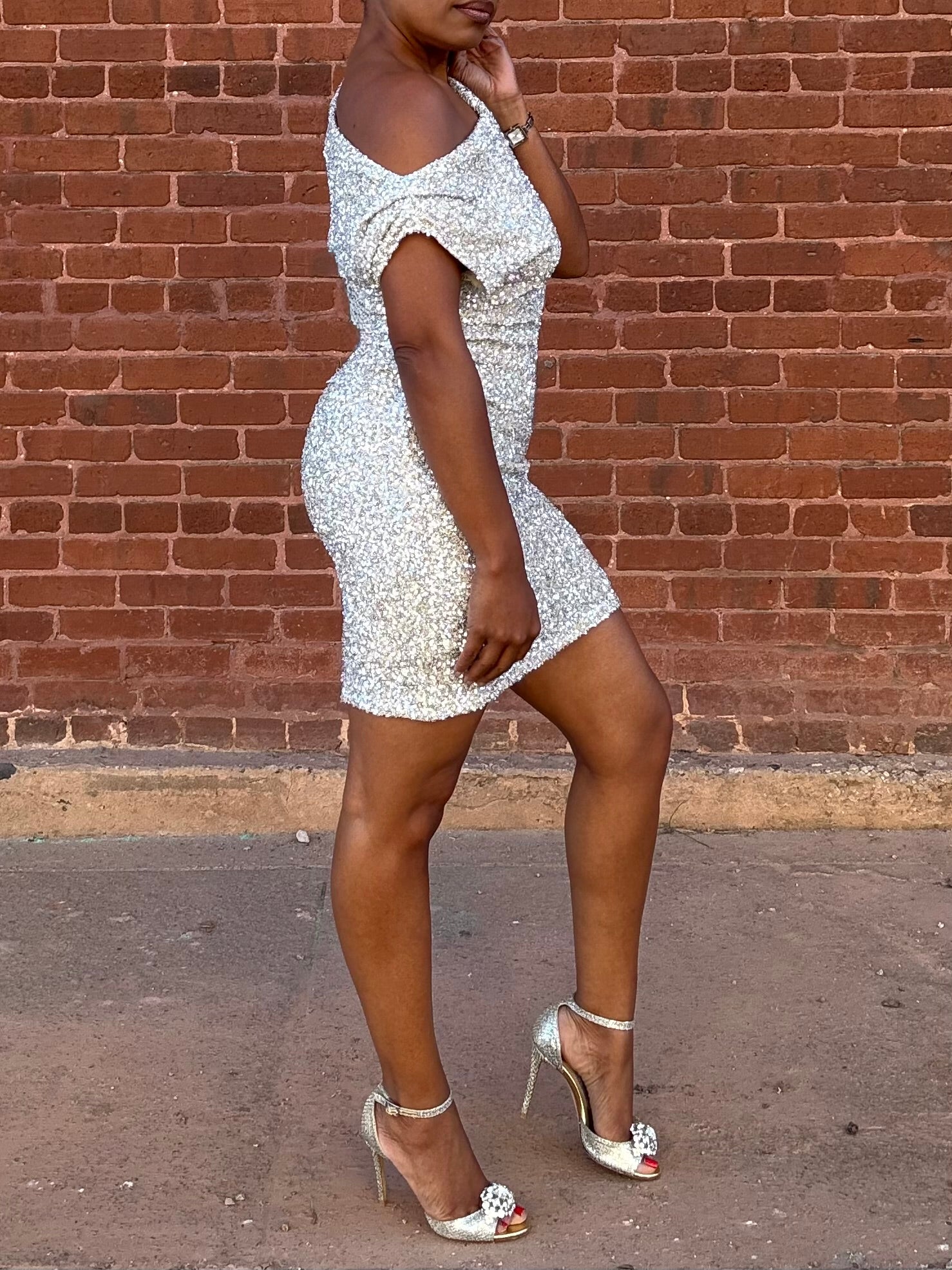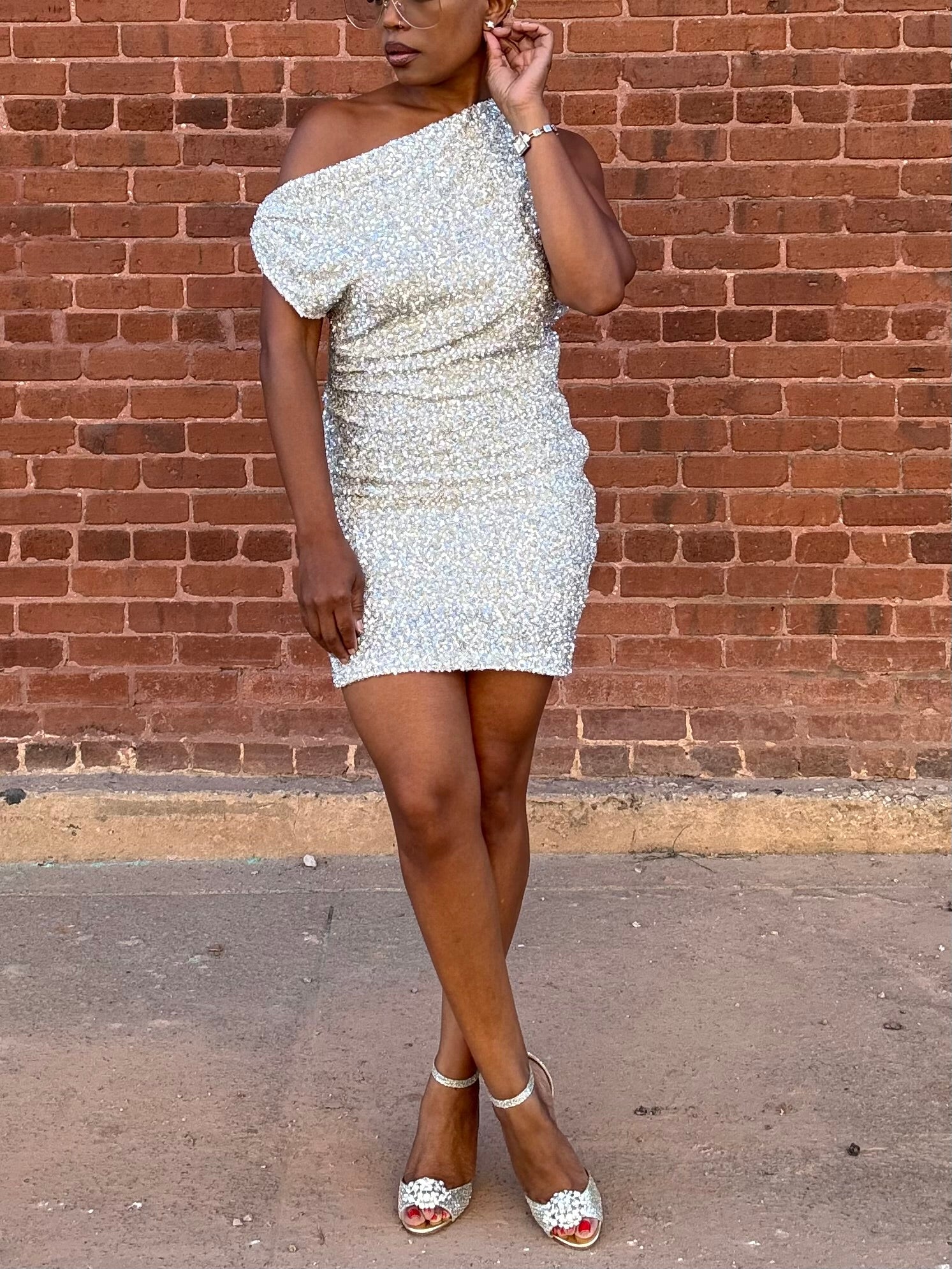 It’s holiday party time! Don’t have those last minute scrambling moments! Full sequin throughout. Cowl wide neckline, sleeveless w/ off one shoulder design. Side zipper closure, ruched mid section. Mid thigh length hem.